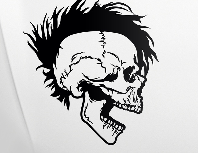Anti-Held im Profil: Autoaufkleber Iro Skull Punk. Dieser Totenkopf mit Irokesen-Schnitt versteht sich als Bild gewordene Kampfansage ans Establishment und Zeichen für Anarchie, Freiheit und Spaß.
