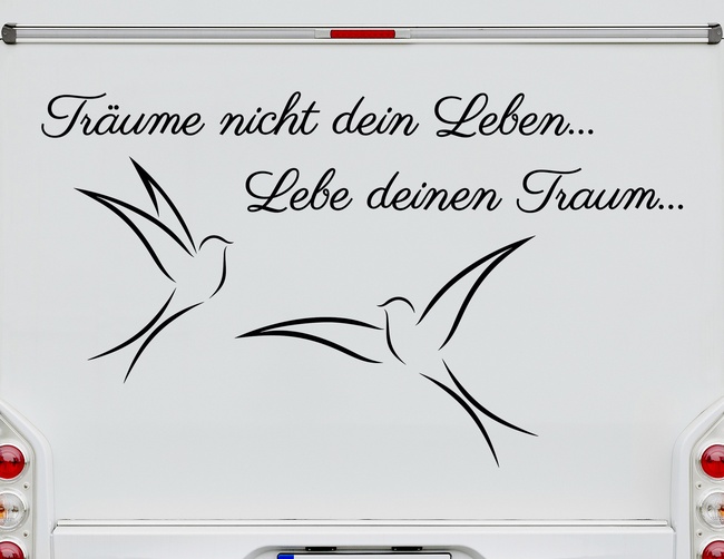 Unterwegs sein, schöne Landschaften entdecken, neue Leute kennenlernen – und dabei erfahren, was das wahre Leben ausmacht – was könnte schöner sein? Und genau darum geht es beim Spruch "Träume nicht dein Leben, lebe deinen Traum…", welcher samt zweier Schwalben zum Ausdruck bringt, was es heißt, auf Reisen zu sein und den Traum von Freiheit zu leben. Autoaufkleber "Lebe deinen Traum"; toll z.B. auf dem Bus, Camper oder Wohnwagen.