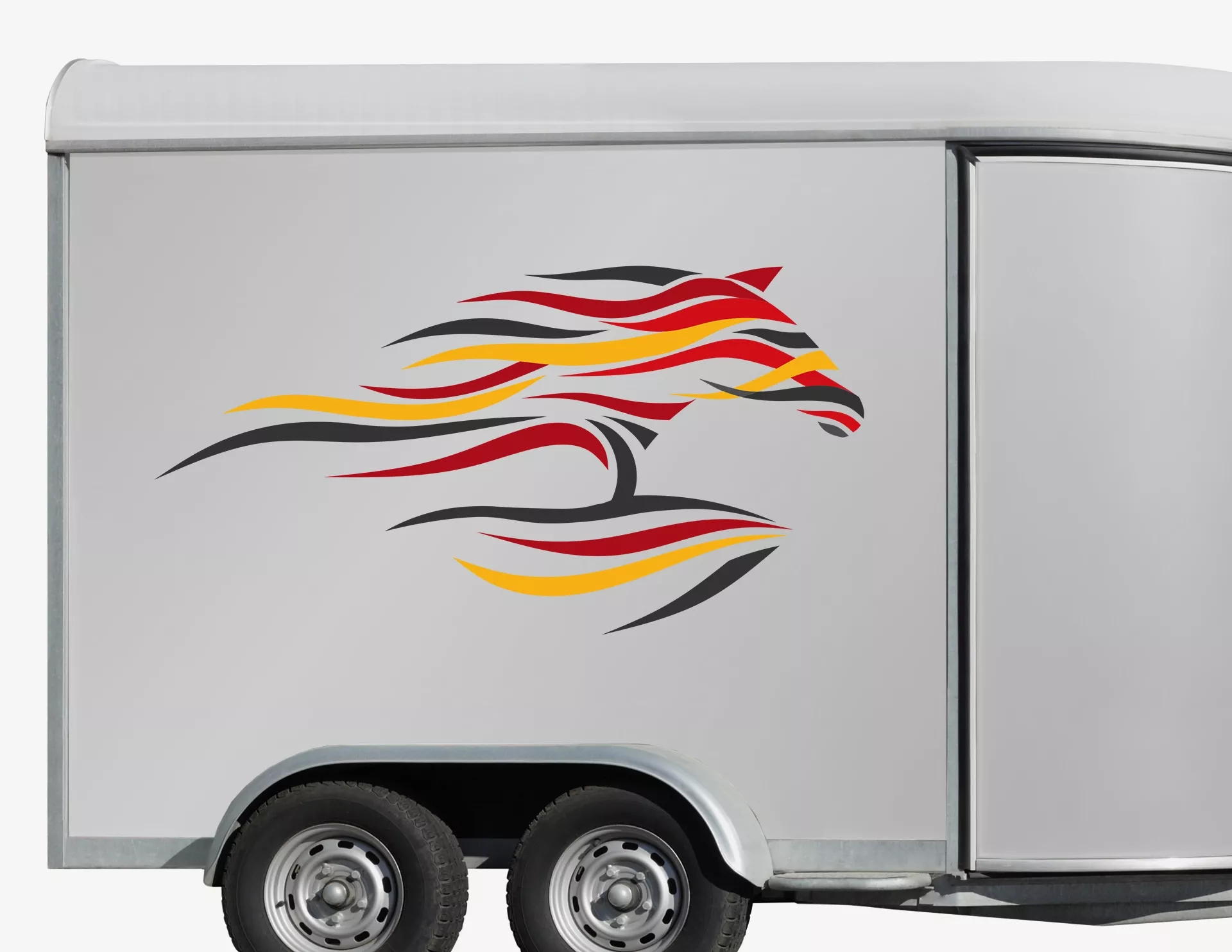 Mit dem Autoaufkleber Pferd Chopin wirst Du und Dein Anhänger nicht lange unentdeckt bleiben – ein Motiv, welches einen außergewöhnlichen optischen Akzent setzt, mit einem temperamentvollen Rappen im Sprung, samt wehender Mähne & Schweif, in schönstem Schwarz, Rot und Gelb.