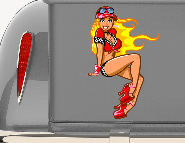 Autoaufkleber "Pin-up Girl Trixie": ein Motiv im Comic-Stil gezeichnet mit einem hübschen Grid-Girl im Checkered-Flag Bikini samt Basecap, Sonnenbrille, Handschuhen und Hot-Rod-Flammenden-Haar.
