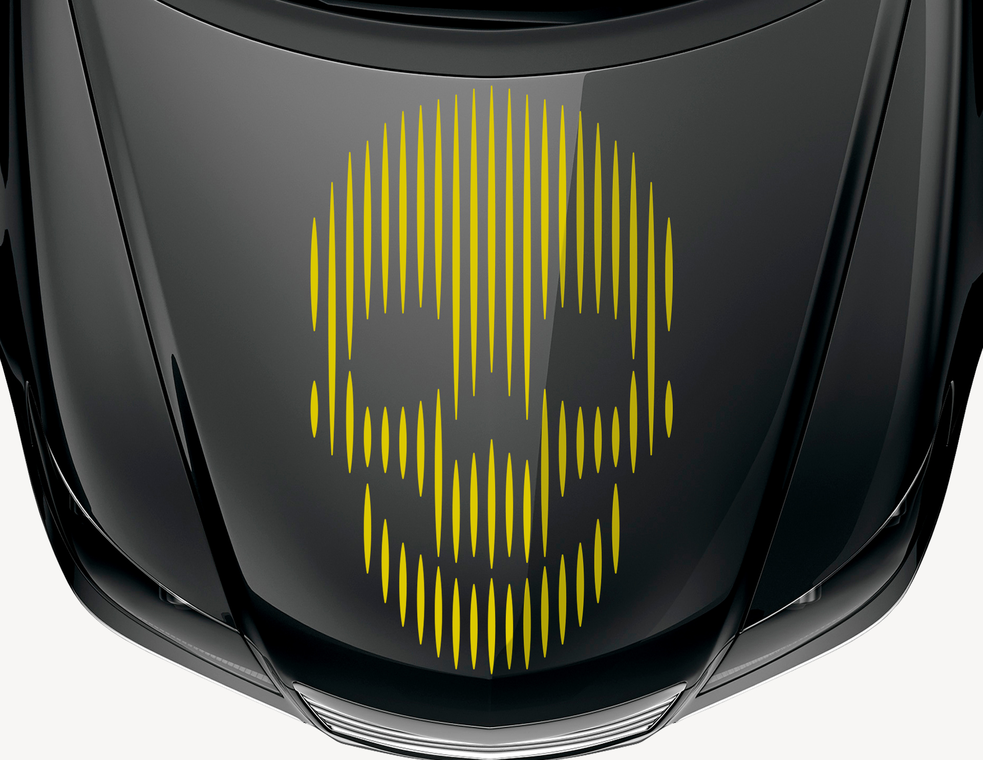 Grüße aus der Gruft! Diese Linien-Grafik zeigt einen Totenschädel mit schaurig dreinblickendem Gesicht. Ein höllisch grinsender Kiefer, eine nicht vorhandene Nase und finstere Augenhöhlen, die nichts Gutes erahnen lassen – hier sind eindeutig dunkle Mächte im Spiel... Mit dem Auto-Sticker "Skullusion" kannst Du Deinem fahrbaren Untersatz so richtiges Grusel-Feeling verleihen und zum Dämon der Rennbahn werden. Aber Vorsicht, nicht zu lange auf den Schädel gucken – denn dieser Reaper erzeugt mit seinem Streifenkopf eine geradezu elektrisierende Illusion.