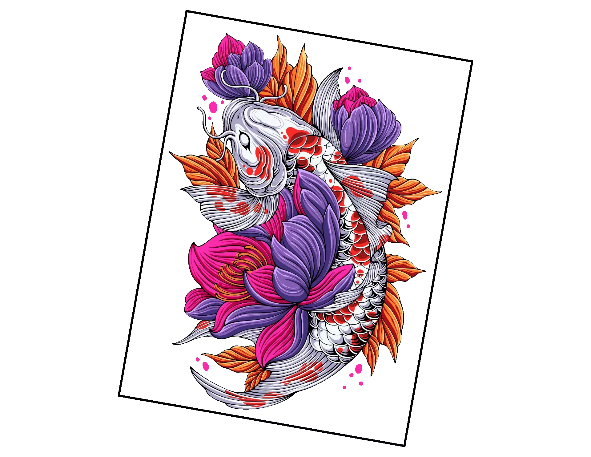 Alles auf Zen: Das White Koi Lotus Artwork erinnert an den klassischen Tattoo-Stil mit vielen Details und tollen Farben. Ein einzigartiges Design mit asiatisch-femininem Touch.