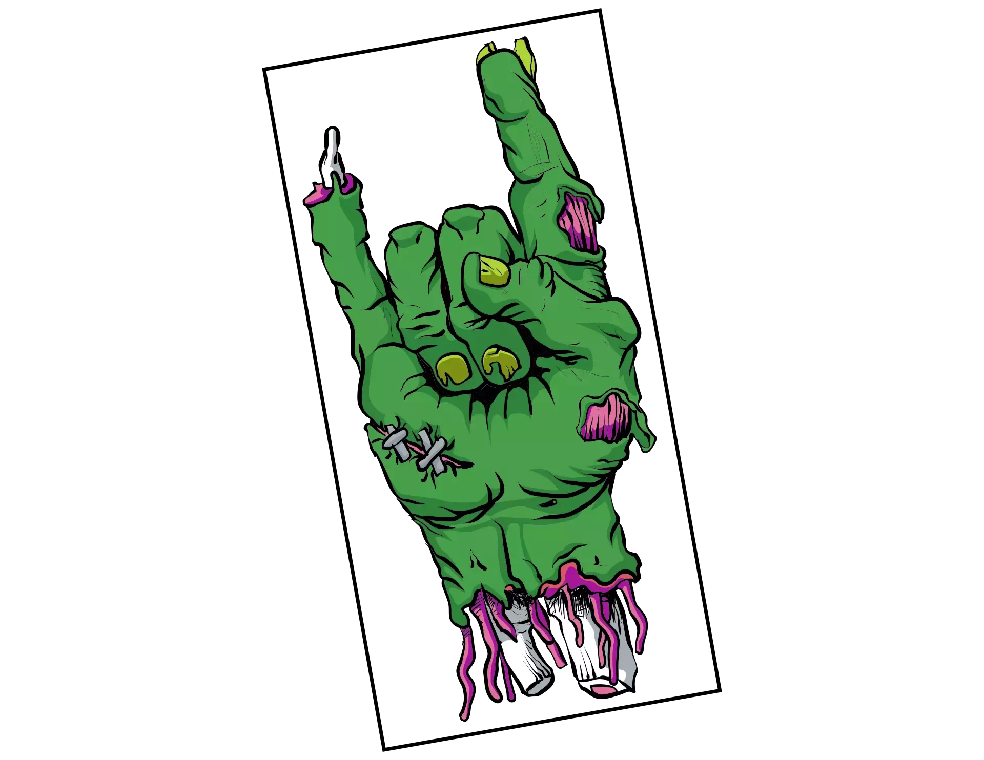 Unsere Zombie Hand vom Motiv-Aufkleber "Zombie Hand Mano Cornuta", wurde vermutlich gewaltsam von einem Arm abgerissen, was gut an den heraushängenden Sehnen und den zersplitterten Knochen zu erkennen ist. Die offenen Wunden werden zusammengetackert von Klammern gehalten und das halb verweste Fleisch ist komplett Grün verfärbt. Aber es ist nicht alles verloren, denn in der Zombie Hand steckt noch etwas Leben, was sie mit dem Fingerzeichen 'Mano Cornuta' beweist.