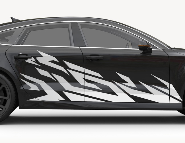 Dieses abstrakte geometrische Muster mit spitz auslaufenden Elementen, sorgt für einen coolen Tuning- und Tarneffekt. Zugleich demonstriert es aber auch Dynamik und Geschwindigkeit durch die ansteigende Seitenlinie.