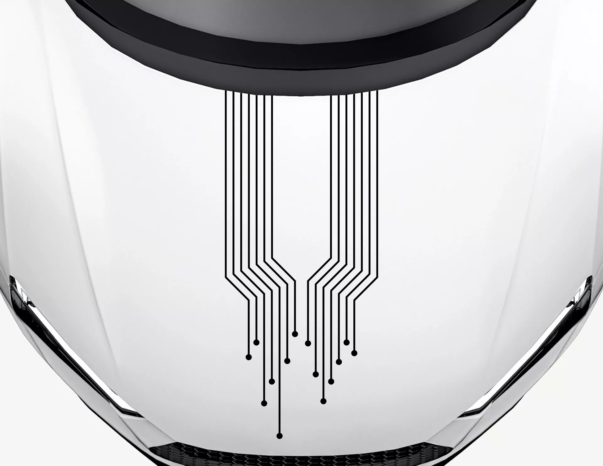 Wer elektrisch fährt, ist nicht nur nachhaltiger und leiser unterwegs, sondern auch technologisch ganz weit vorn. Der Motorhaubenaufkleber E-Speed Liner mit schmalen Linien und kleinen Kreisen wirkt digital, schnell, elektrisch... und das ganz ohne Ladestopp.