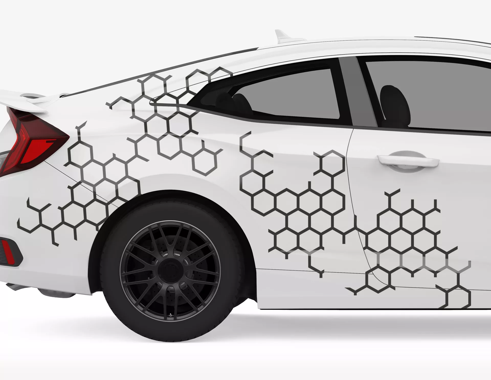 Cooler Carbon-Look in XXL: Autoaufkleber Hacky Hexagon wirkt organisch, technologisch und digital zugleich.