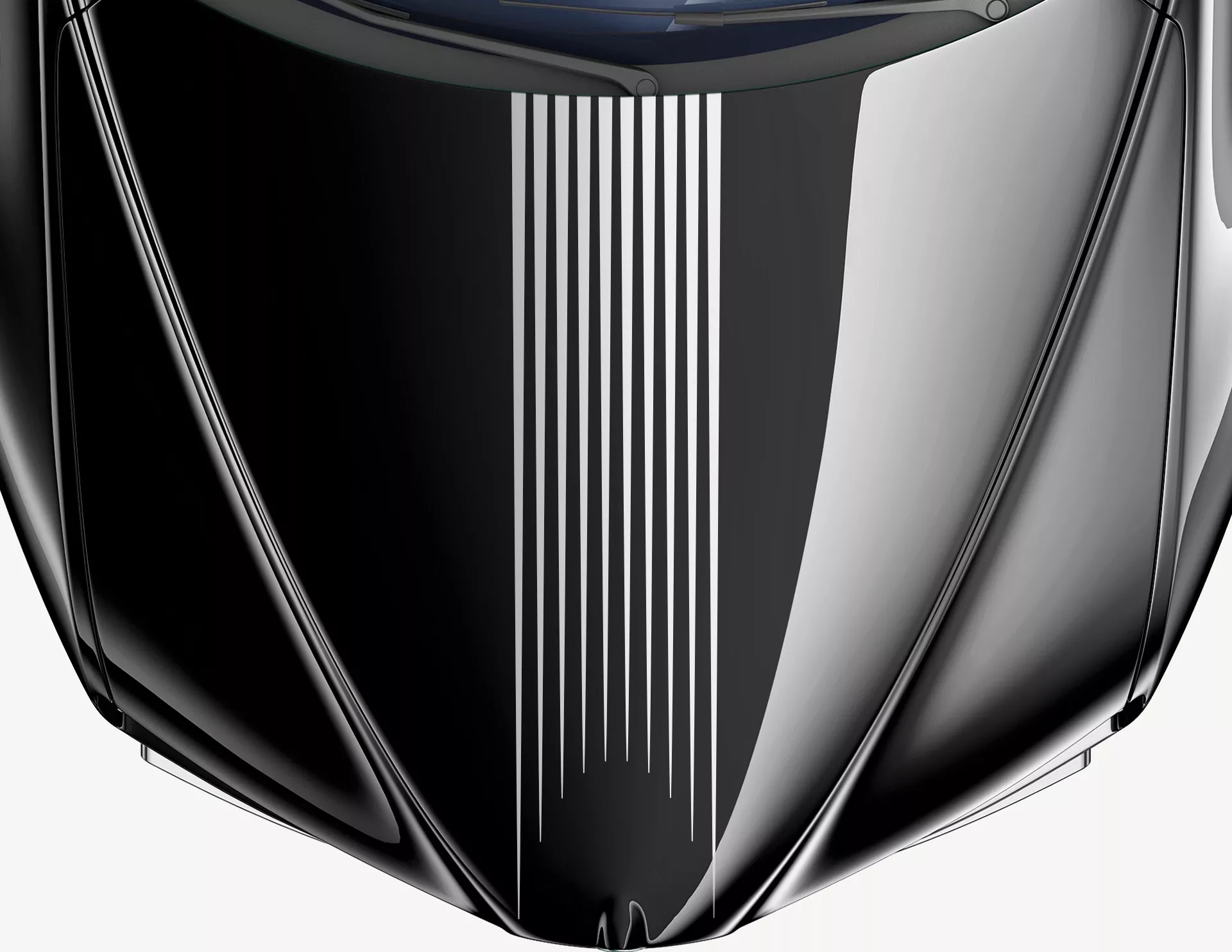 Puristische Schönheit: Zehn Strahlen in perfekter Formation, langgestreckt und oval zulaufend – Autoaufkleber Jet Rays macht Deine Motorhaube zum Designobjekt.