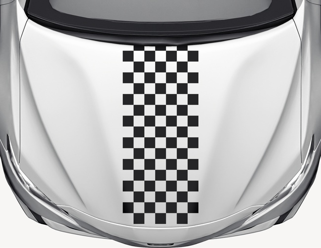Dieser Motorhaubensticker zeigt die im Motorsport bekannte Checker Flag, die beim Rennen den Zieleinlauf signalisiert. Autoaufkleber Rallyestreifen Karo #7 mit sieben Karo-Reihen – ein heißer Racing-Look für coole Autotunings.