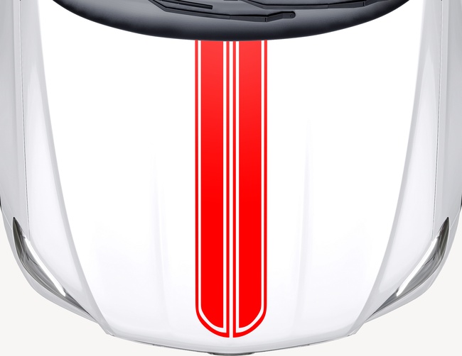 Rallyestreifen für die Motorhaube in coolem Look: Autoaufkleber „Victorious Vibe“ mit breiterem Kern-Streifen, schmaler Kontur und abgerundeter Frontkante.