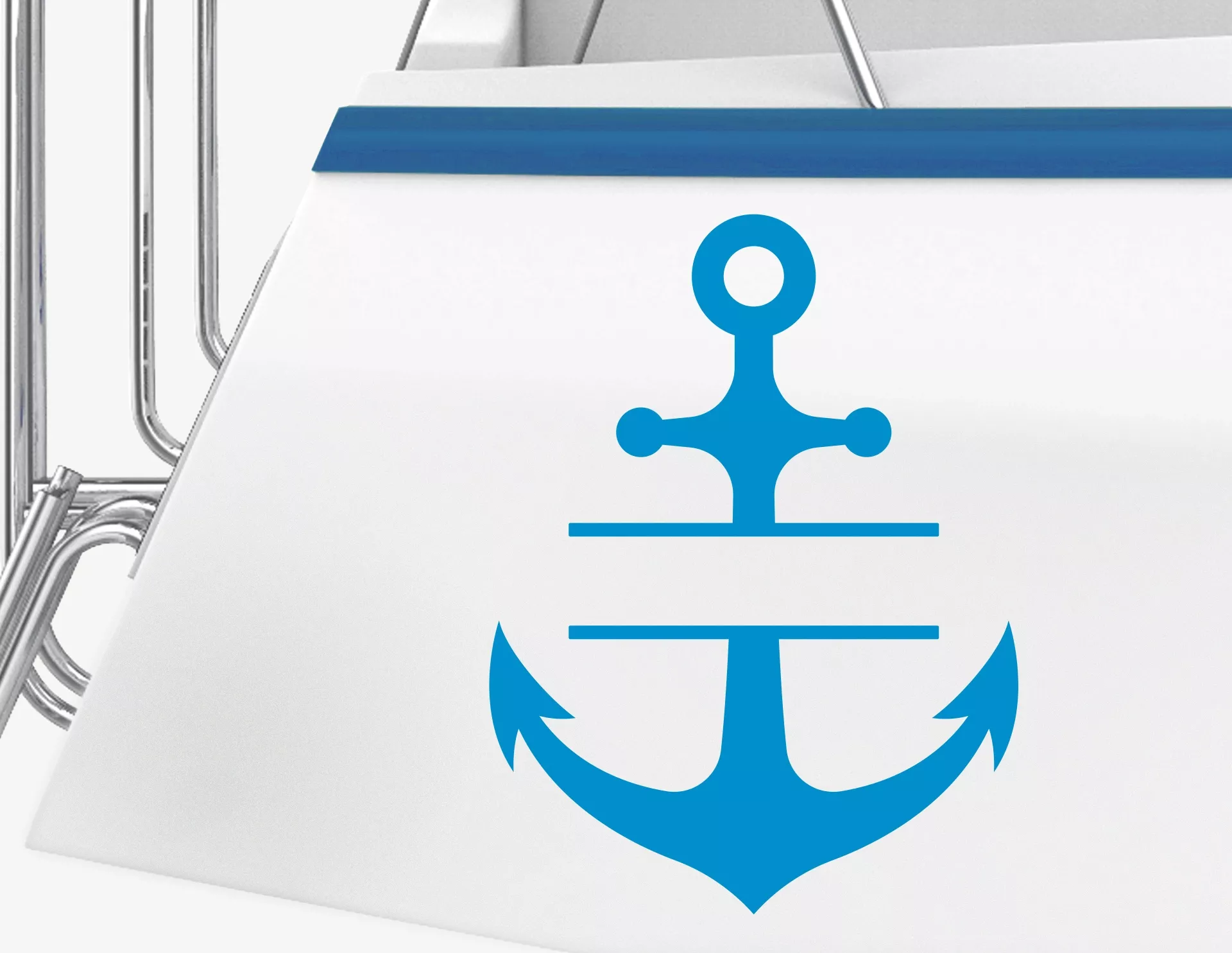 DIY-Idee: Unser maritimes Anker-Motiv funktioniert auch als Rahmen und bietet die Möglichkeit, einen Bootsnamen mit einzufügen. Den Aufkleber einfach in der Mitte durchschneiden und je einen Teil über- und unter den Bootsnamen kleben. Fertig!