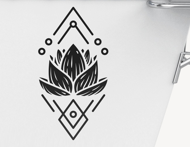 Florales Formenspiel: Eine moderne Komposition aus Lotos-Blüte, Linien, Rauten und geometrisch Formen. Gefühlvoll, spirituell und mit viel guter Energie: Unser Bootsaufkleber Geolotus.