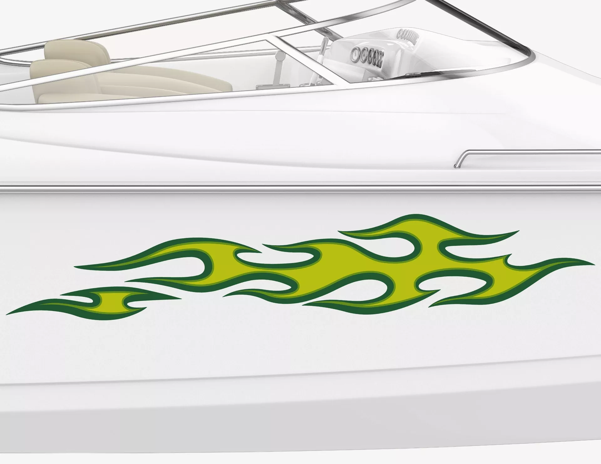 Für Boote werden gerne auffällige Designs gewählt, um z.B. die Motorleistung auch optisch zu unterstreichen. Warum also nicht mal extravagante Flammen auf den Bootsrumpf kleben? Dieser Motiv-Aufkleber überzeugt mit seinem sportlich rasanten Aussehen und passt perfekt zu allen schnellen Wasserfahrzeugen – Bootsaufkleber "Green Flames"!