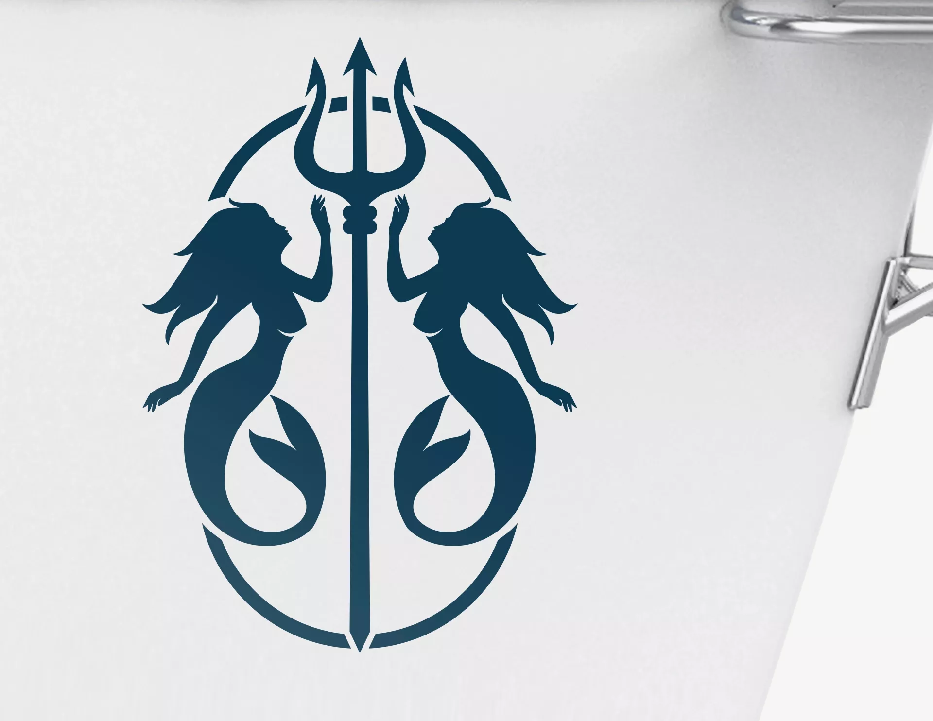 Ornamentales Tiefsee-Spektakel: Bootsaufkleber Neptuns Nixen mit zwei Meerjungfrauen, Dreizack-Zepter in der Mitte und ovalem Rahmen. Für einen ganz individuellen Look in Deiner Wunsch-Farbe und Größe.