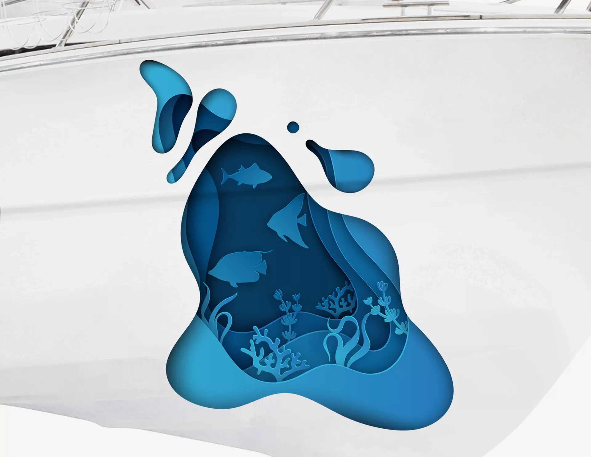 Ob es am Rauschen liegt, der klaren Luft oder dem angenehmen Klima – am Wasser verbrachte Zeit ist immer schöne Zeit! Unser maritimer Bootsaufkleber "Paper-Art Ocean" nimmt genau dieses Gefühl auf: mit Korallen, Wasserpflanzen, Wellen und Fischen gespickt, führt hier der Blicke in die wunderschön blaue Meerestiefe.