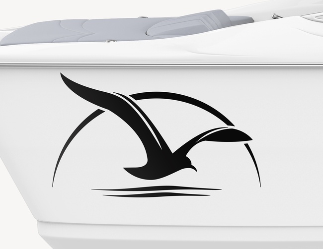 Auf und davon, mit dem Bootsaufkleber Seabird Supreme. Mit fliegender Möwe, Halbkreis-Sonne und Wellen, für einen ganz individuellen Look in Deiner Wunschfarbe und Größe.