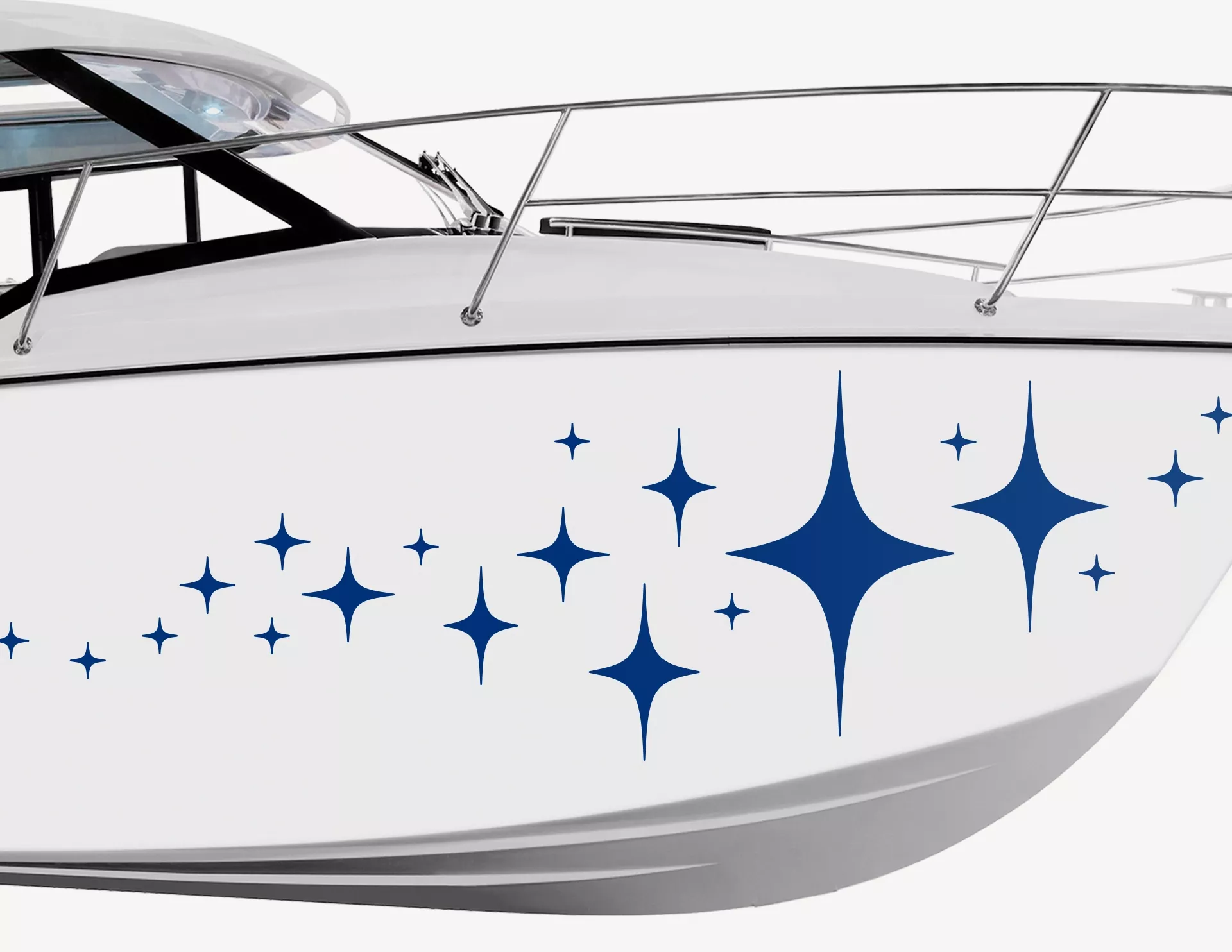 Eine Prise Sternenstaub à la Las Vegas: DIY-Bootsaufkleber "Stardust" mit vielen großen und kleinen rautenförmigen Sternen zum selbst verkleben.