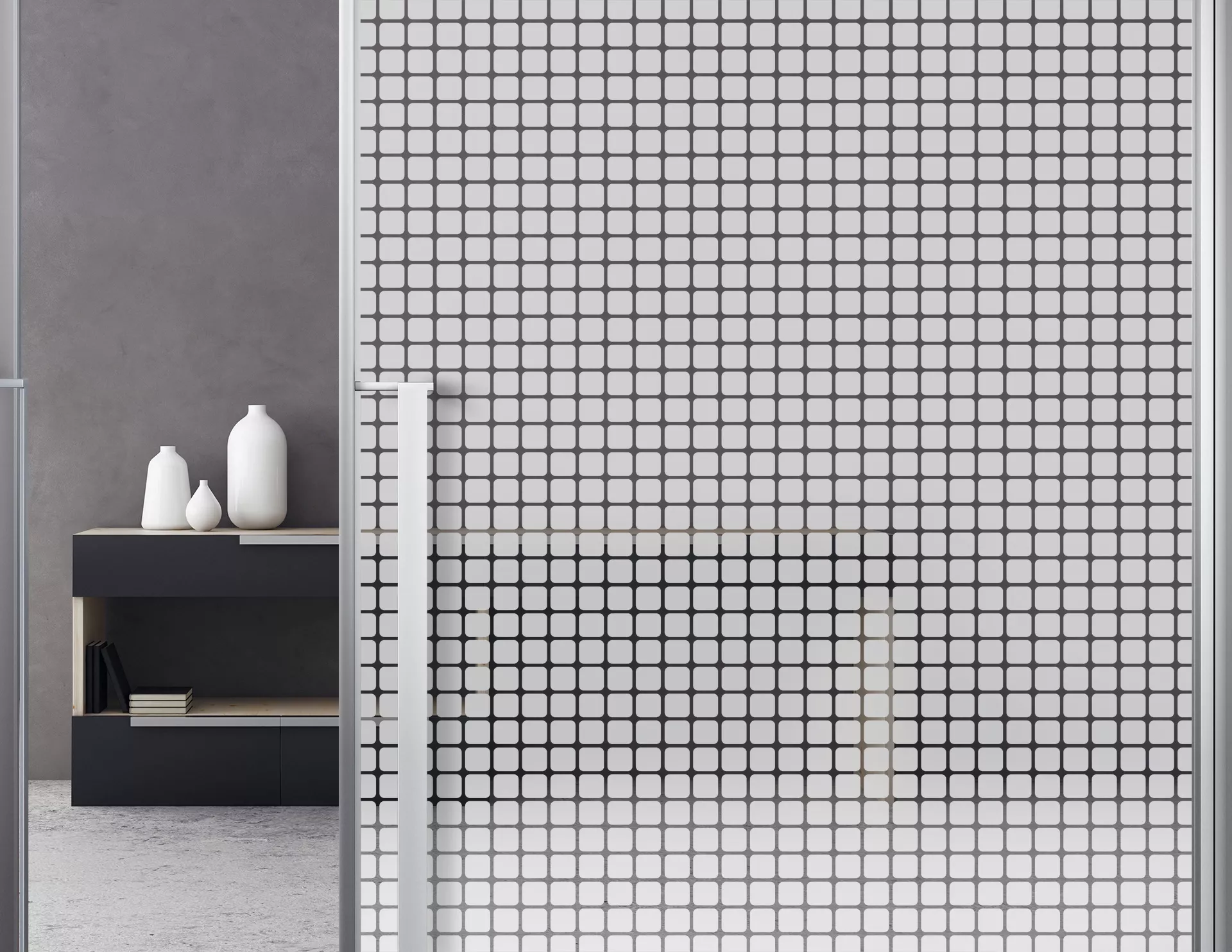 Designs in Milchglasfolie fürs Bad online bestellen. Gemütliche Ästhetik dank eines nahezu blickdichten Quadratmusters.