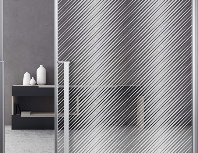 Duell der Linien: Die aufstrebend-diagonal verlaufenden Linien der Milchglasfolie „Victor“ spielen mit verschiedenen Breiten und erzeugen so einen grafischen Gradations-Effekt. Durchsichtige und solide Bereiche wechseln sich in ständiger Wiederholung ab und erzeugen ein optisches, schwingendes Streifenmuster und wunderbaren Blickfang.