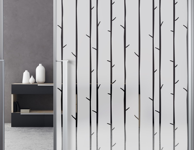 Man sieht den Wald vor Bäumen nicht? In diesem Fall ist das sogar gewollt, denn die Milchglasfolie „Woody“ erlaubt, dank abstraktem Baum-Muster, nur eine partielle Durchsicht.