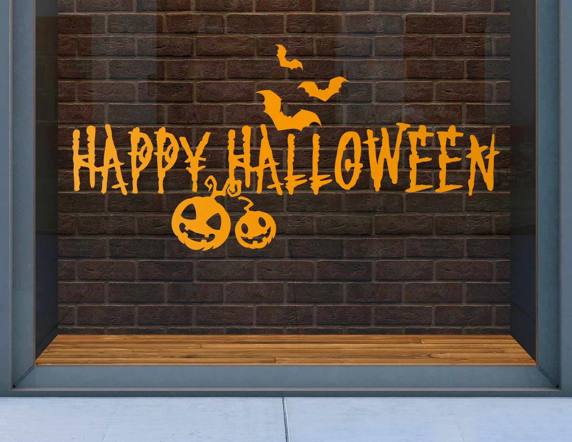 Trick or Treat? Keine Angst; diese Kürbisse und Fledermäuse sind freundlich gesinnt und wollen am Tag der Toten nur ein bisschen umher geistern. Also Süßes raus, sonst spukt's im Haus! Aufkleber Happy Halloween: Eine schaurig schöne Dekoration zum Día de los Muertos – für Schaufenster, Ladengeschäfte & Co.