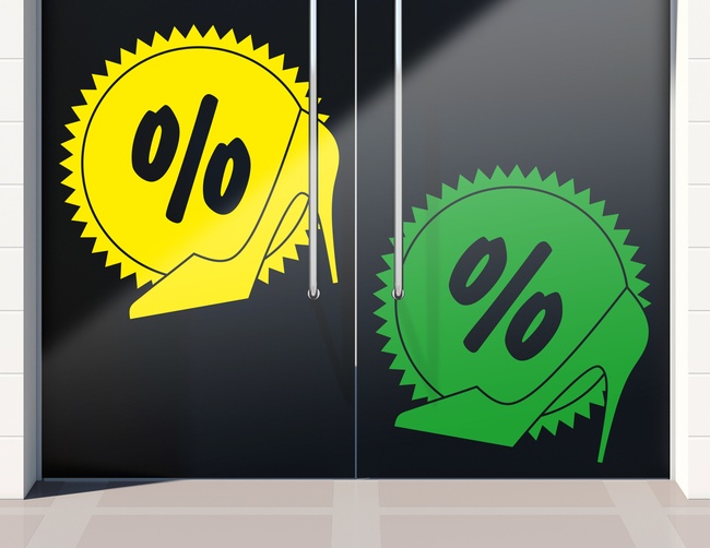 Entdecke den High Heels low Price Aufkleber bei Klebefisch.de – hochwertiger Folien-Plott mit Prozentzeichen und Schuh-Design. Perfekt für Schaufenster und Rabattaktionen!