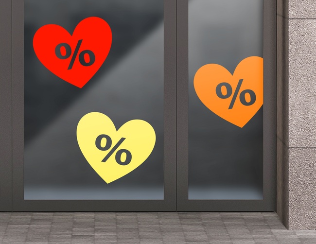 Entdecke den Prozente Herzen Aufkleber bei Klebefisch.de – hochwertiger Folien-Plott mit liebevollem Design. Perfekt für Schaufenster und romantische Rabattaktionen!