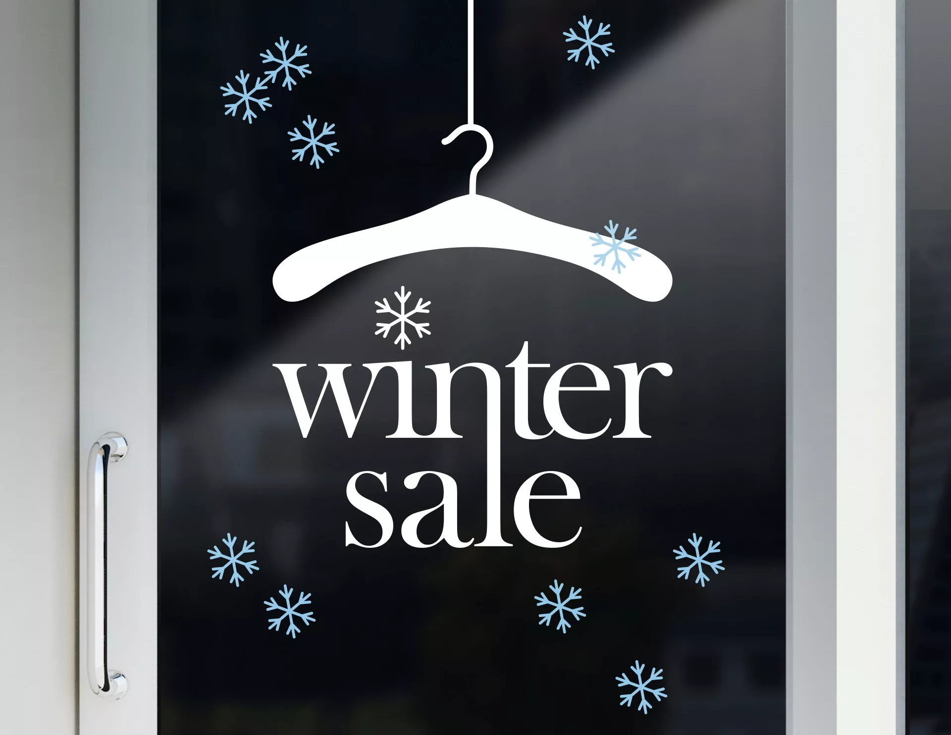 Für viele Kunden ist der Winterschlussverkauf die beste Saison zum Shoppen und Schnäppchen jagen. Damit Kunden auch von Deinem Schlussverkauf erfahren, sollte Schaufenster und Gewerbefläche entsprechende Dekoration aufweisen. Mit dem Aufkleber „Winter Sale“ erhält Dein Geschäft einen attraktiven Kundenstopper passend zum WSV. Der Window Sticker preist reduzierte Ware an und sieht dabei besonders elegant und chic aus. Der Schriftzug sitzt direkt unter einem stilvollen Kleiderbügel und wird von kleinen Schneeflocken umrahmt. So erhält Dein gesamter Laden eine schöne winterliche Aufmachung. Darüber hinaus signalisiert diese Schaufensterbeschriftung den Mode Aspekt Deines Gewerbes.