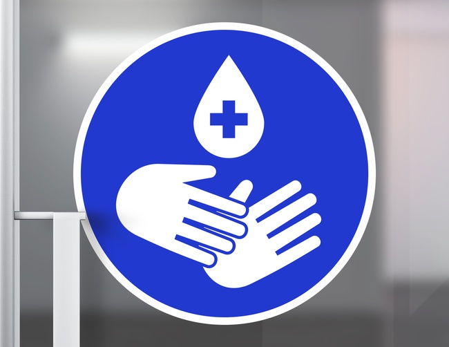 Die Verwendung von Desinfektionsmitteln ist wichtig und kann vor einer möglichen Ansteckung mit Viren schützen. Genau das beschreibt visuell dieser rund Motiv-Aufkleber in Blau und Weiß: Mit zwei Händen, einem Tropfen samt Kreuz, welches das Desinfektionsmittel symbolisiert.