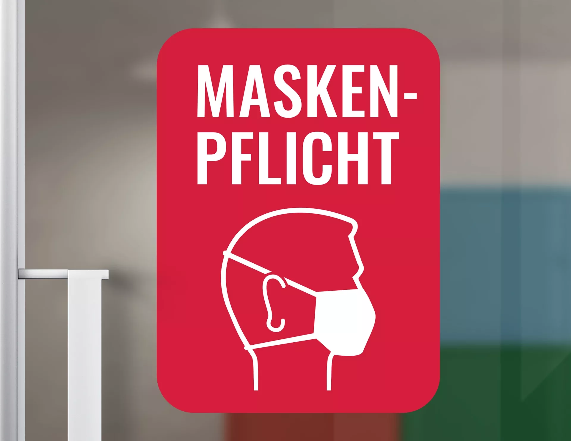 Der Aufkleber "Maskenpflicht" klebt auf allen glatten Oberflächen wie z.B. Wänden, Möbeln, Türen oder Glasflächen.