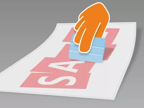 Aufkleber flach ausrollen und mit Rakel (oder Kreditkarte) fest über Vorder- und Rückseite streichen.