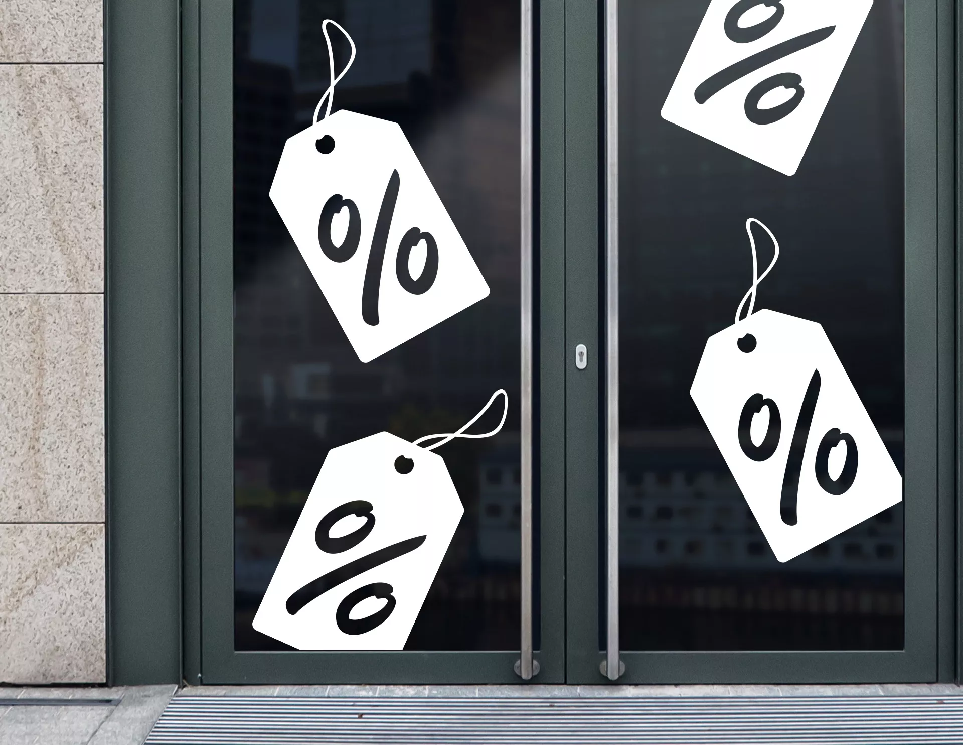 Die Schaufenster Aufkleber „Prozente Anhänger“ lassen Kunden auf den ersten Blick erkennen: Hier gibt es reduzierte Ware und Rabatte.