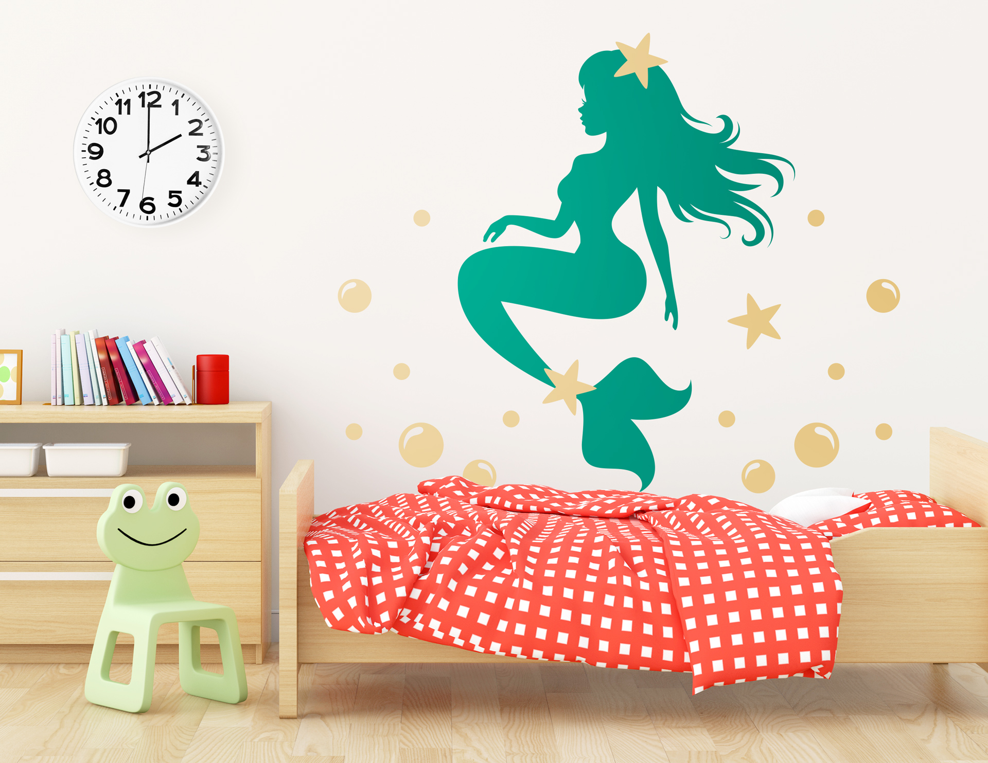 Das Wandtattoo „Meerjungfrau Jade“ sticht im Raum durch eine kontrastreiche Umsetzung hervor und verzaubert jeden Betrachter.
