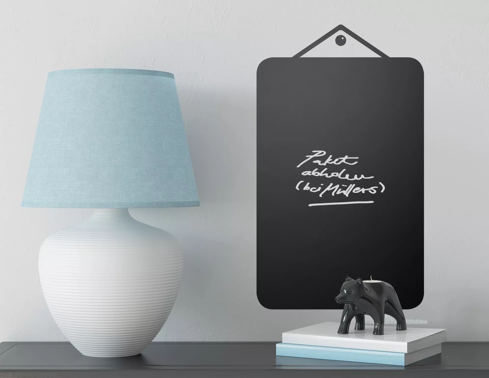 Formschön mit angedeutetem Nagel und Hänger, nicht zu verspielt und nicht zu nüchtern. Die Klebefolie ist leicht montiert, wiederbeschreibbar mit Kreide und Tafelstift.