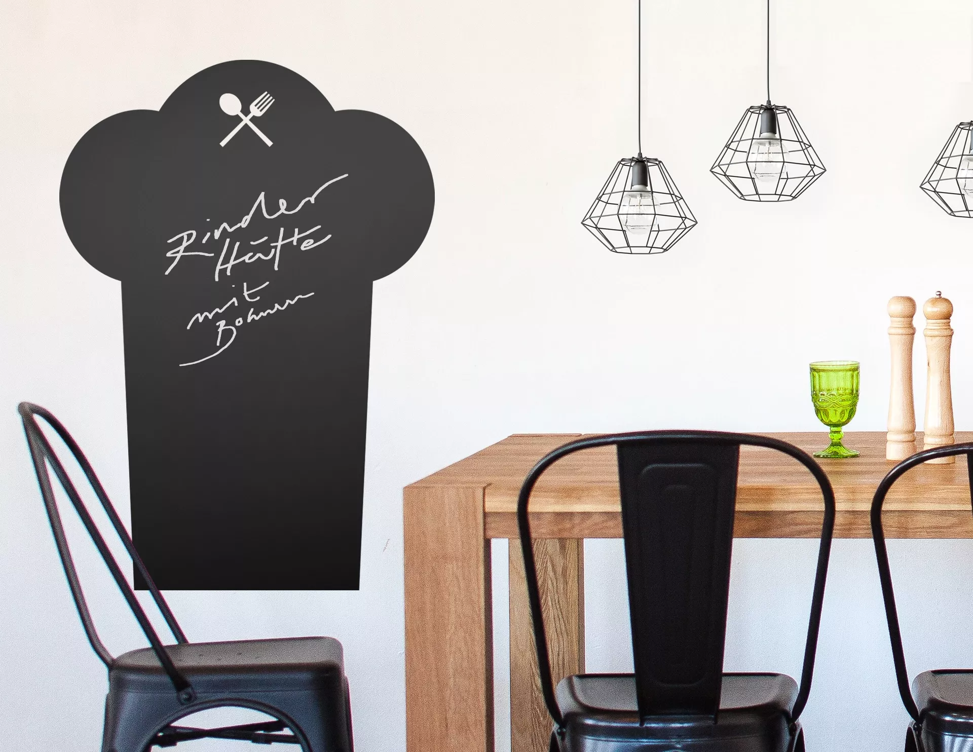 "Qui, chef" ...na klar geht es hier ums Kochen! Unsere Tafelfolie "Kochmütze" präsentiert wechselnde Gerichte, Angebote, die Einkaufsliste und alles andere, woran man sich so erinnern möchte.