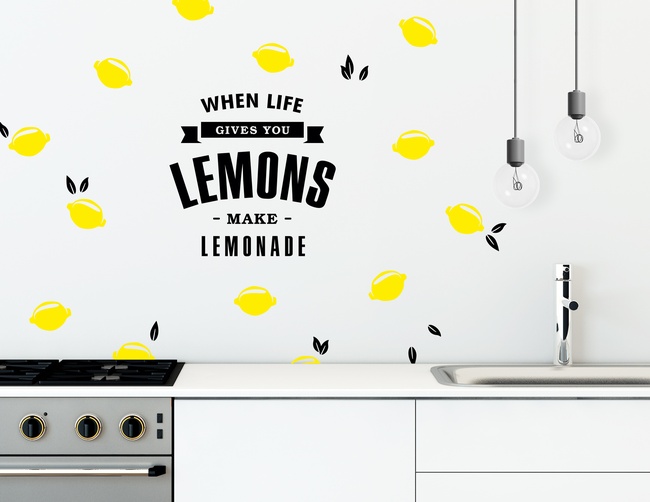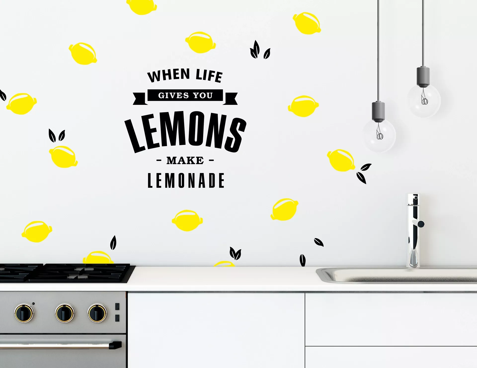 Sauer macht lustig: Mit dem Wandtattoo „Lemonade“ bekommst gleich eine XXL Vorratspackung an Humor mit nach Hause. ‚When life gives you lemons make lemonade'.