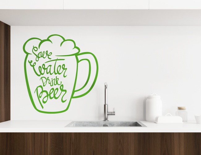 Spare Wasser trinke Bier! Diese Aussage ist nicht ganz ernst gemeint, denn zu Bier braucht es nun mal Wasser. Wer sich ein wenig mit dem goldenen Hopfensaft auskennt weiß, dass gleich welcher Sorte – ob Pils, Pale Ale, Lager oder Craft-Bier die Grundzutat Wasser ist. Das richtige Wasser entscheidet nach dem Brauprozeß über die Qualität des Bieres. Wir können zwar kein Bier brauen aber wir haben hierzu passend ein Wandtattoo gestaltet, aus Bierkrug und Handlettering. Ideal z.B. für die Küche oder den Essbereich.