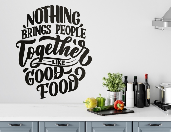 Wandtattoo "Food brings People together": ein typographisches Design mit kunstvoll geschriebenen Buchstaben im Lettering-Stil, das perfekte Accessoire für die Küche oder den Essplatz.
