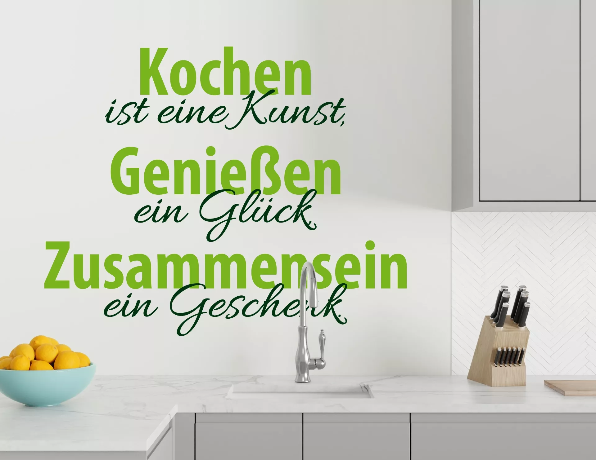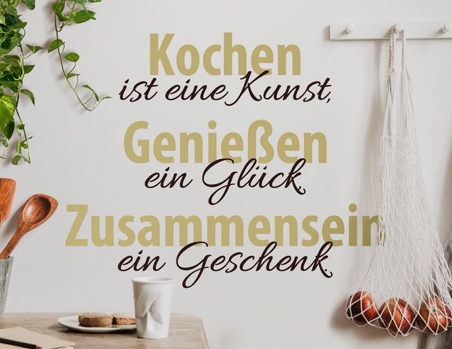 Ein wunderbarer Wandspruch für ein wohnliches Zuhause: Kochen ist eine Kunst, Genießen ein Glück, Zusammensein ein Geschenk. Unser Text-Design verziert jede Küche und erinnert täglich an die wertvollsten Dinge, die wir haben. Für eine besonders individuelle Dekoration ist dieses Wandtattoo zweifarbig bestellbar. Mach' Deine Küche unverwechselbar!