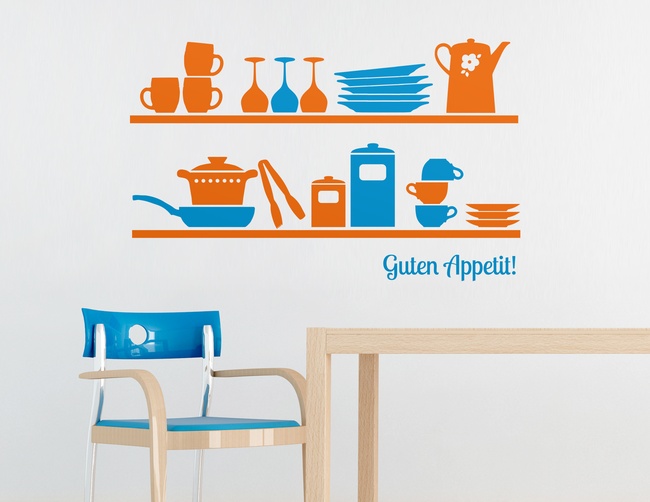 Was kommt ganz ohne Dübel und Schrauben aus und hält einiges an Hausrat an der Wand zusammen? Das klebende Küchenregal! Alle Becher, Gläser und Teller können nach Lust und Laune angeordnet und arrangiert werden. Herrlich diese Wanddeko, ein echter Augenschmaus für Deine Küche. Wir wünschen viel Freude beim kreativen dekorieren und kochen. Na dann guten Appetit. Dieses Design kannst Du als einfarbiges oder mehrfarbiges Wandtattoo bestellen, Du hast 53 Farben zur Auswahl.
