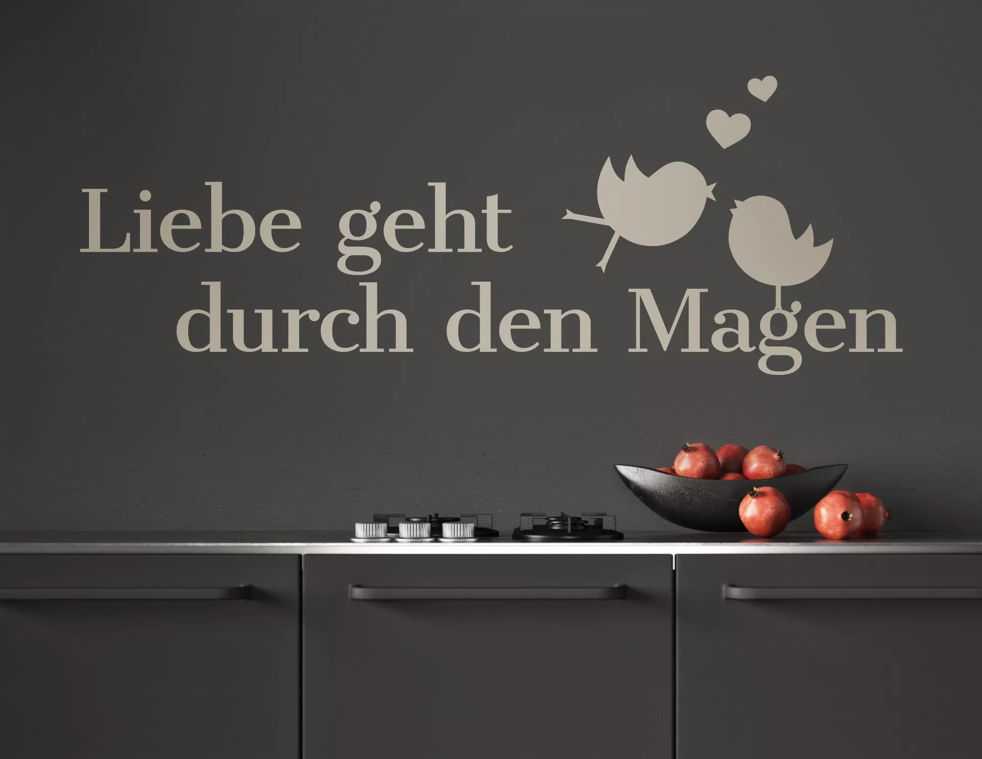 'Liebe geht durch den Magen.' Wo dieses bekannte Sprichwort seinen Ursprung hat, ist nicht ganz klar. Was man aber weiß, ist dass dieser Spruch wohl aus einer Zeit stammt, als die Rollenverteilung zwischen den Geschlechtern klar definiert war und die gute Hausfrau ihrem hart arbeitenden Ehemann täglich mit leckerem Essen verwöhnte. Aber egal wer kocht, ob Mann oder Frau – es ist immer schöner gemeinsam zu essen als alleine. Unser Wandtattoo "Liebe geht durch den Magen" samt zweier Vögelchen und Herzen für Verliebte, Romantiker und Valentinstags-Fans.