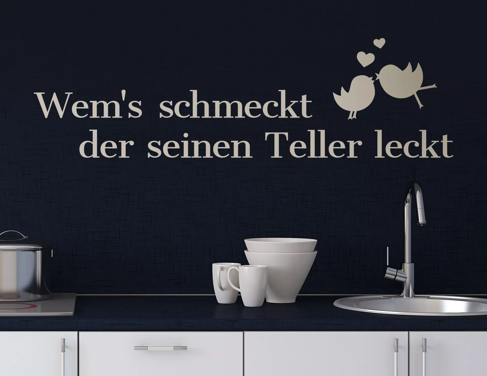 Ob Fünf-Gänge-Menü beim Sternekoch oder Muttis Eintopf: wenn das Essen richtig lecker war, dann will man keinen Bissen übrig lassen. Am liebsten möchte man sogar den Teller abschlecken. Oder wie unser Wandtattoo es ausdrückt: "Wem's schmeckt der seinen Teller leckt." Damit ist diese Dekoration perfekt geeignet für die Küche, Essecke oder das Wohnzimmer – mit Vögelchen und Herzen.