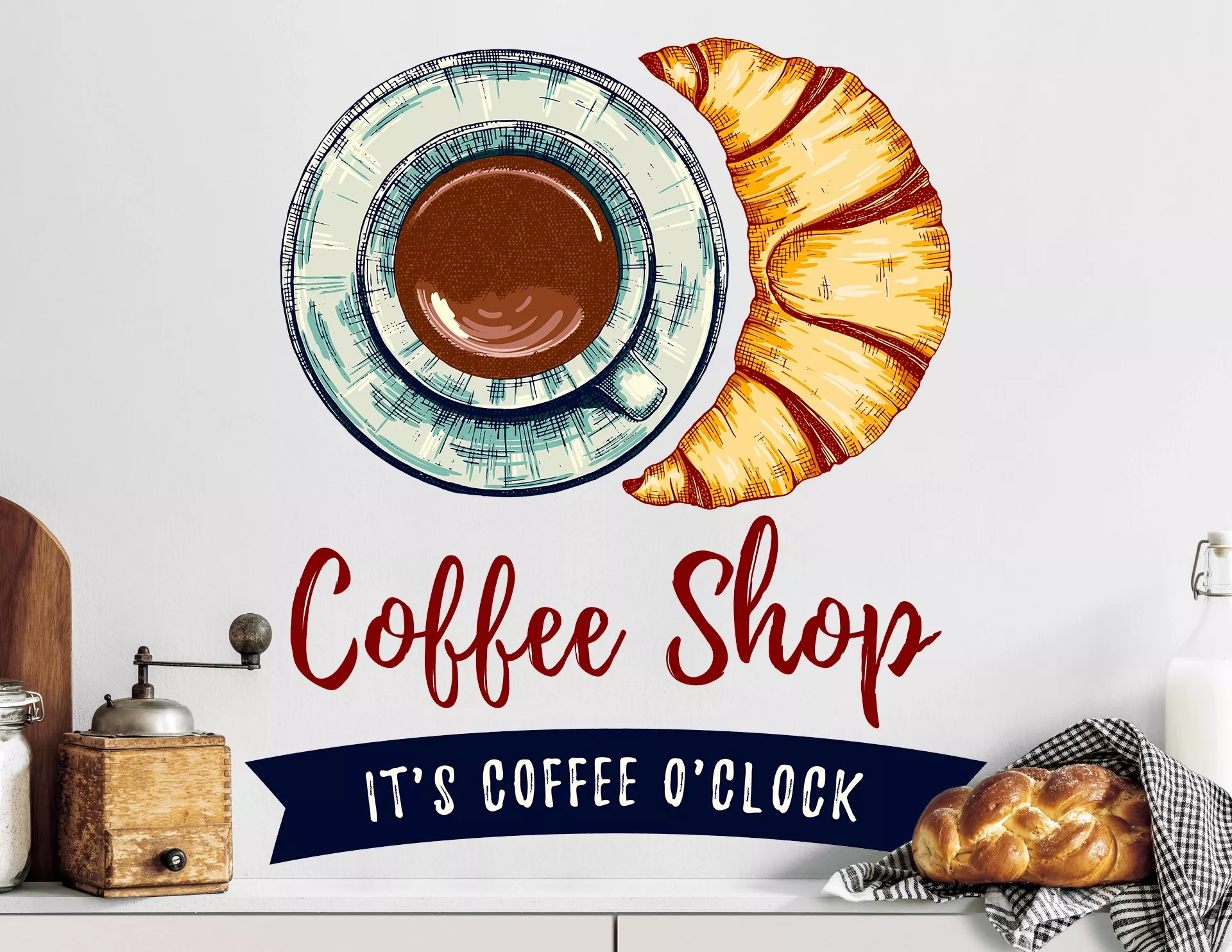 Wir spielen in unserem ganz privaten Coffee-Shop mit Brühtemperatur und Mahlgrad. Trainieren unsere Geschmacksnerven um Arabica-Bohnen von Liberica-Bohnen unterscheiden zu können und genießen obendrauf leckeren Milchschaum und Gebäck. Dazu passt dieses handillustrierte Design im Vintage-Stil mit Kaffeetasse, Croissant samt Spruch und schafft, echte Kaffeehaus-Atmosphäre in Deinen vier Wänden – Wandtattoo "It's Coffee o' Clock"!