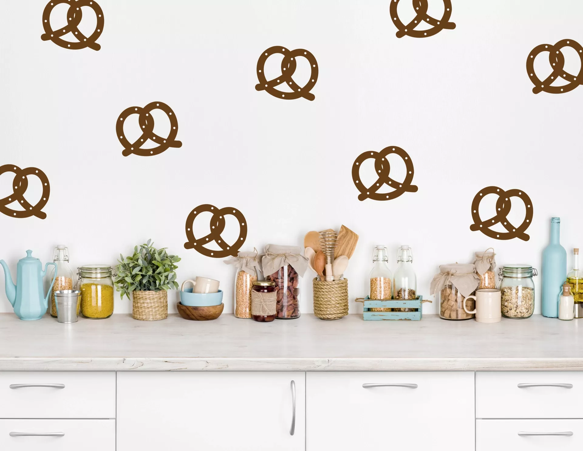 Den meisten von uns ist die Brezel als traditionelles Wappenzeichen des Bäckerhandwerks bekannt. So ist die Brezel auch ein handwerkliches Produkt geblieben, vermutlich weil der Bäcker zum Verschlingen der Brezelarme eine bestimmte Wurftechnik einsetzt. Auch wir finden Brezeln überaus lecker und haben deshalb das Wandtattoo "Aufgebrezelt" gestaltet.