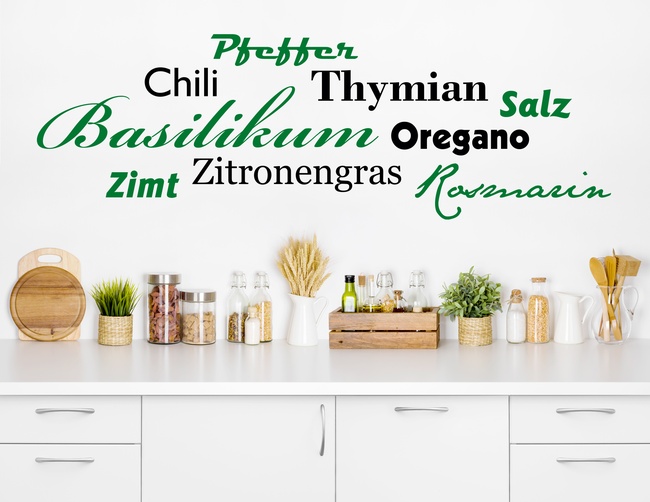 Wandtattoo "Gewürzflair", ein Dekorelement, das den Duft der großen, weiten Welt in Deine Wohnung zaubert. Nichts ist so inspirierend und himmlisch zugleich, wie der Duft frischer Kräuter. Kräuter und Gewürze sind ein klein wenig Urlaub, ein Hauch fremder Kulturen und die Sehnsucht nach der Fremde. Kräuter sind das Salz in der Suppe und verfeinern jedes Gericht auf unvergleichliche Weise. Unser Gewürzflair- Wandaufkleber zaubert eine köstlich, kreative Atmosphäre auch in Deine Küche!