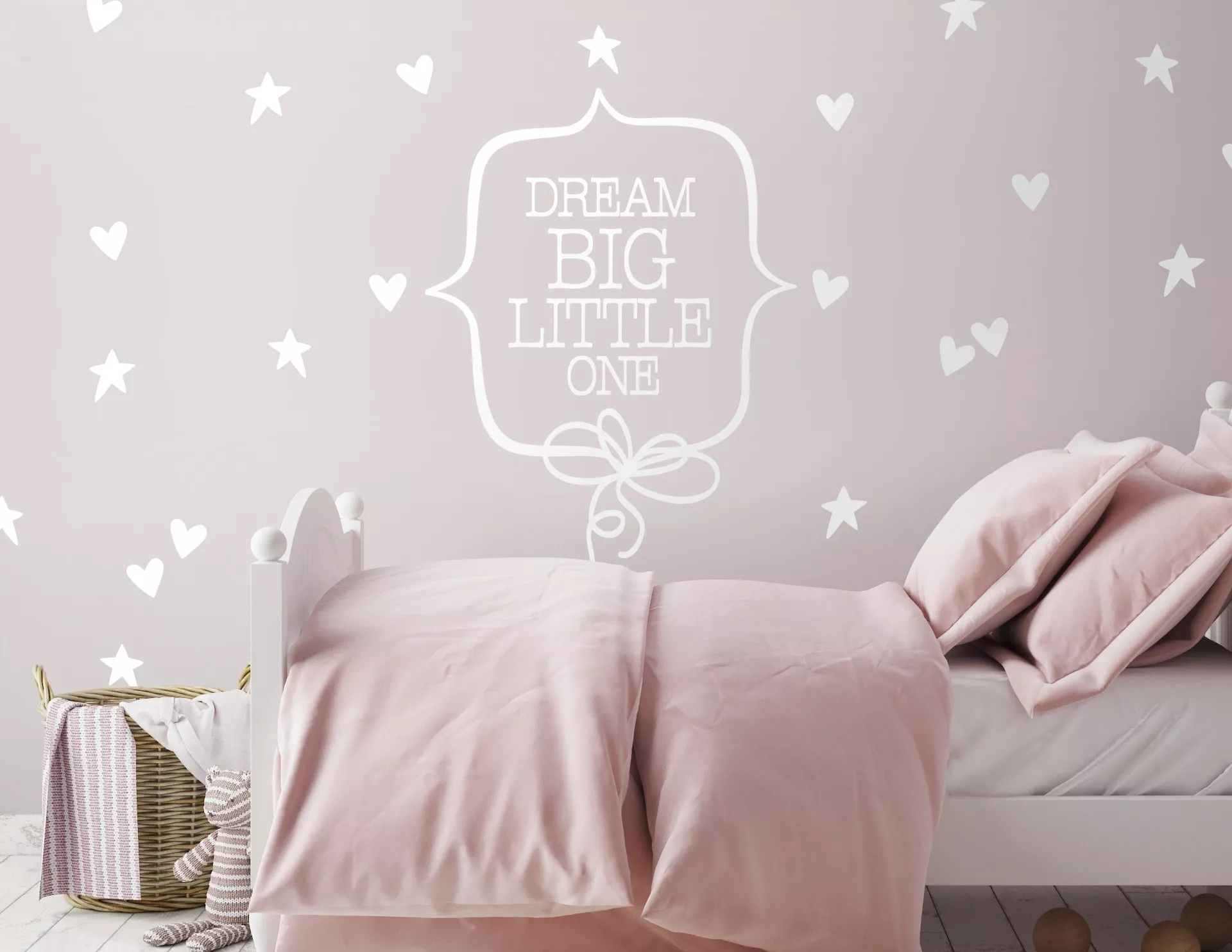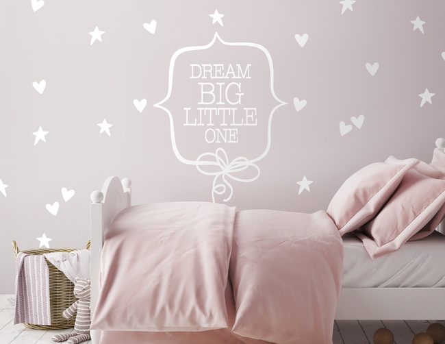 "Dream Big little one", heißt auf Deutsch: 'Träume groß, Kleines'. Für alle kleinen Engel mit großen Träumen: Das Wandtattoo „Dream Big“. Diese süße Wanddekoration macht das Einschlafen schöner und wirkt wie handgemalt. "Dream Big" kommt im Set mit vielen kleinen Herzen und Sternen. Mit den insgesamt 28 Herzen und 28 Sterne kannst Du Dein eigenes Muster gestalten. Ein Gute-Nacht-Gruß für die Wand, der von ganzem Herzen kommt.