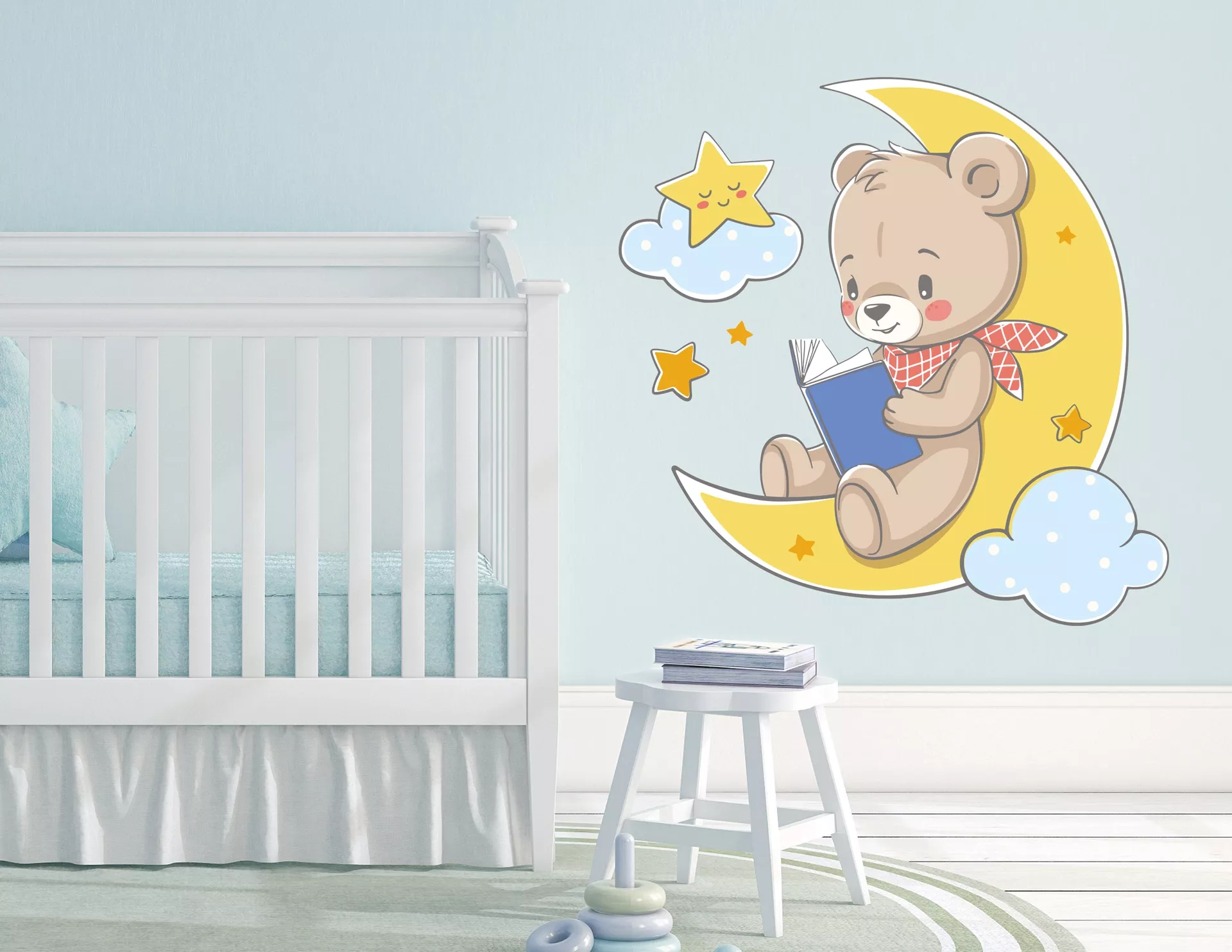 Der Mond ist schon längst aufgegangen und strahlt hell vom Himmel herab, aber Timmy unser gutherziger Teddybär kann einfach noch nicht einschlafen. So macht er es sich mit seinem roten Halstuch auf der großen, gelben Mondsichel gemütlich und blättert noch ein wenig in seinem Lieblings-Gute-Nacht-Geschichten-Buch. Zwei Wölkchen ziehen sacht an ihm vorbei und ein Stern ruft leise – es ist nun Schlafenszeit, komm' zur Ruh' und mach die Augen zu. Wandtattoo "Gute Nacht-Teddy Timmy", eine Dekoration zum Staunen und Träumen.