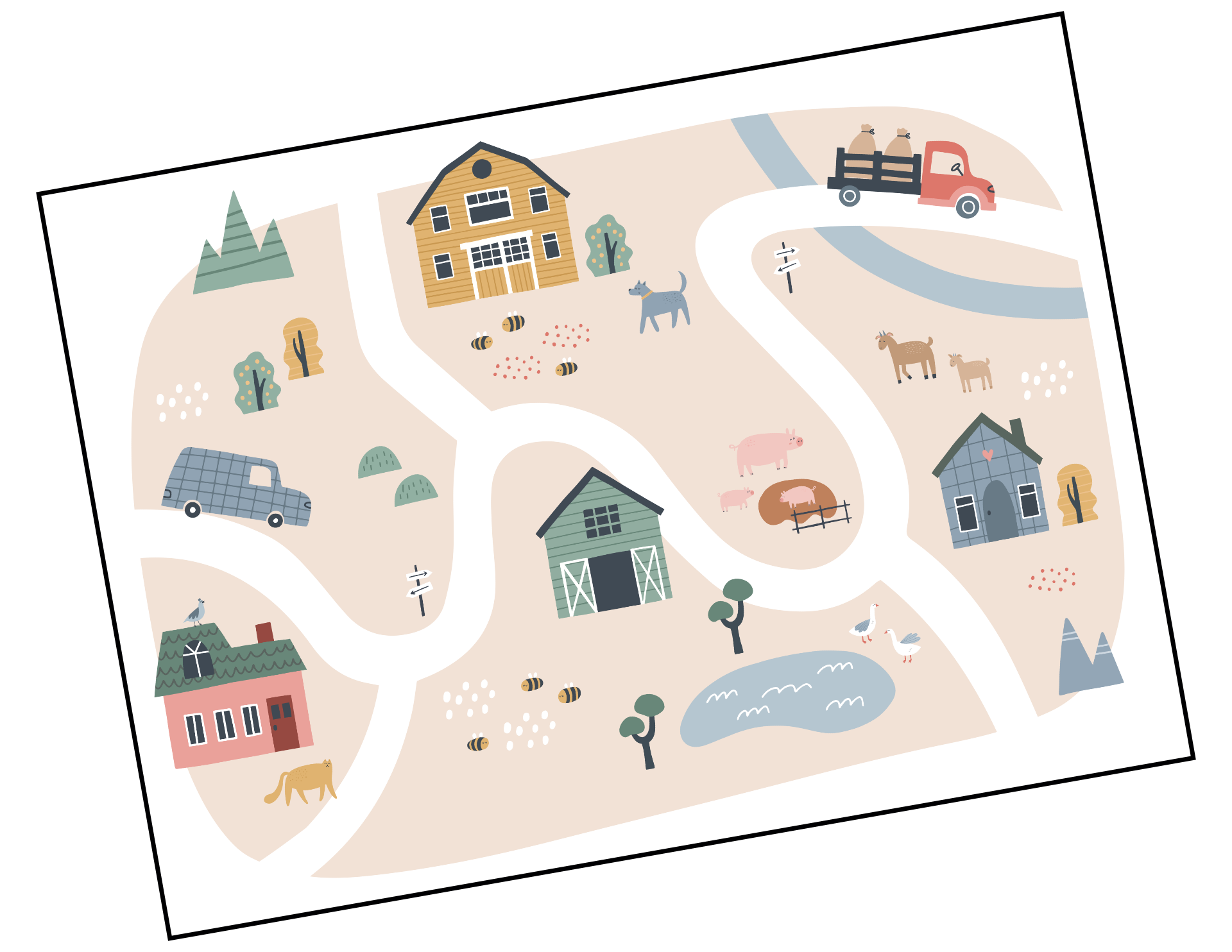 Ein idyllischer Ort mit Straßen, Häusern, Lieferwagen, einem Weiher und vielen Tieren – darunter Schweine, Pferde, ein Hund und eine Katze. Diese friedliche Szenerie zeigt das Wandtattoo Rosarotes Landleben, welches im Kinderzimmer Mädchen wie auch Jungs gleichermaßen begeistert. Die Kids können auf dem Motiv viel entdecken und Eltern erfreuen sich an einer kreative Wanddekoration im reduzierten Skandi-Look.