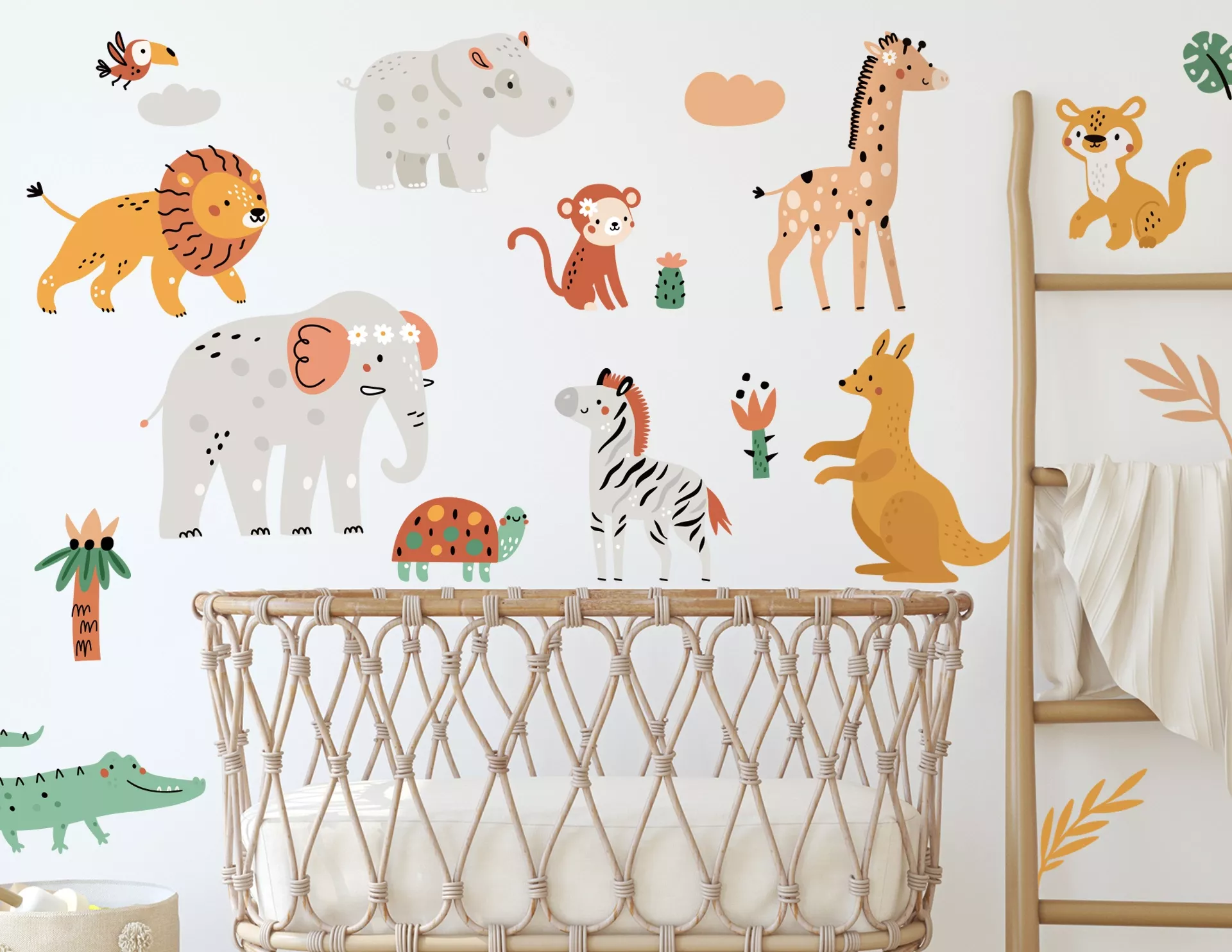 Was mögen Kinder am liebsten? Spielen natürlich! Da geht es Tierkindern genauso wie unseren Menschenkindern. Diese niedlichen Zootiere haben zusammen jede Menge Spaß und so sorgen Affe, Elefant, Giraffe, Känguru & Co. auch als Wandtattoo im Kinderzimmer für viel Freude. Das kunterbunte Sticker-Set lässt sich nach Lust und Laune aufkleben und verschönert blitzschnell Wände, Möbel oder Türen.