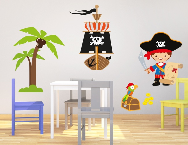 Wandtattoo Toby der kleine Pirat: eine detailreiche Dekoration, bestehend aus fünf Teilen, für unerschrockene Weltumsegler und kleine Entdecker.