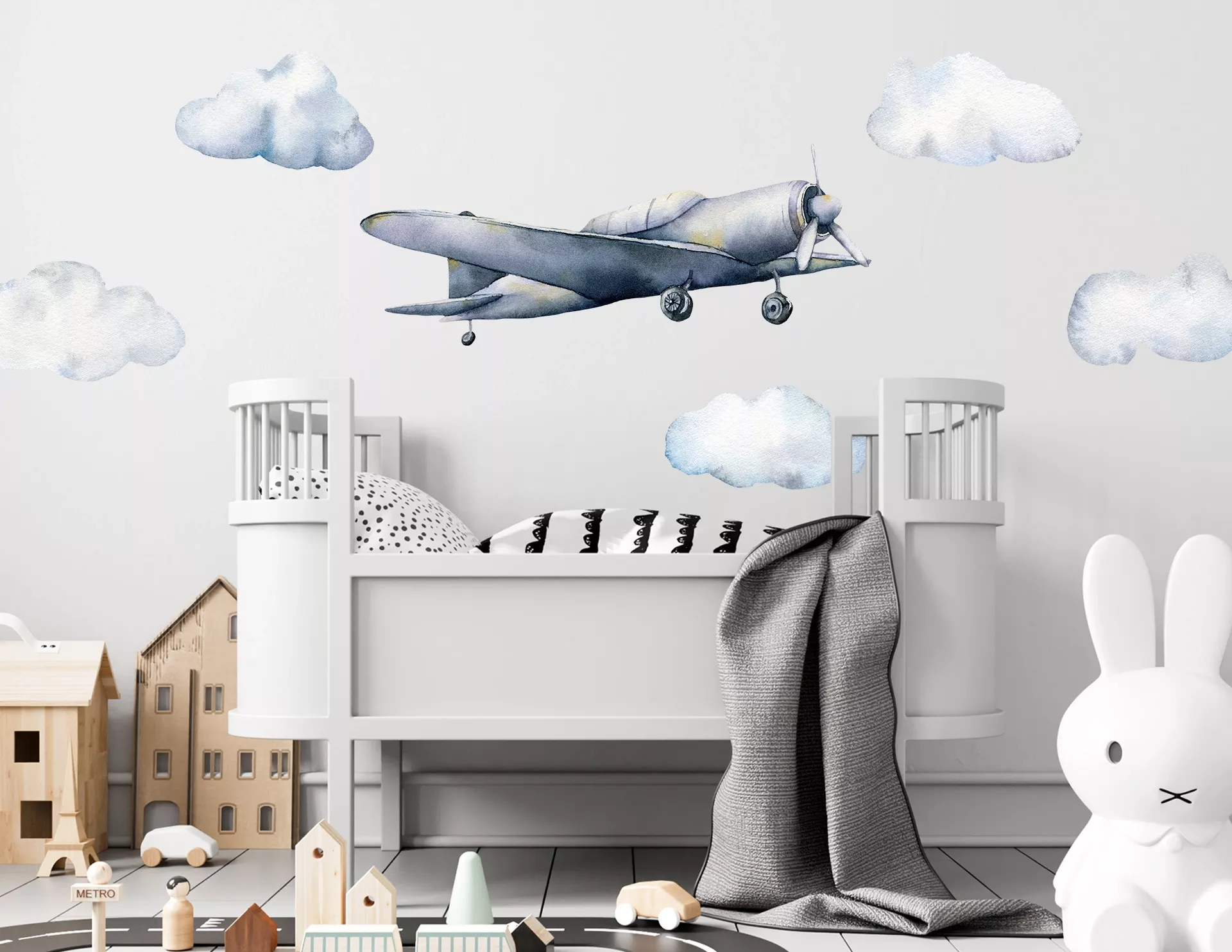 Nochmaaal in die Luft… und den Himmel erobern! Irgendwo brummt ein Flugzeug, gleitet durch fluffige Wolken und zieht weiße Streifen am Horizont. Für einen Tag Pilot sein, davon träumt fast jeder und der 'Traum vom Fliegen' ist beinahe so alt wie die Menschheit selbst: Denn gibt es etwas Aufregenderes als die Welt von oben aus dem Flugzeug zu erleben? Sicher nicht… Wandtattoo „Wolkenflieger Aquarell“. Ein niedliches Wasserfarben-Design in schönstem Blau, mit einem Propeller-Flugzeug samt fünf kleiner Wolken für Technikinteressierte, Abenteurer, Tüftler, Luftfahrt- und Reise-Fans.